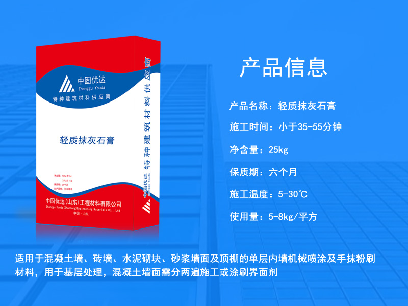 它具有良好的保水性和工作性,用于加气混凝土等吸水力强的墙体,能保证抹灰后水化反应完全,抹灰层强度不会因失水而降低。 对于各种墙面,如混凝土、加气混凝土等均无需进行界面处理,可直接使用,有效节约工程成本,节约工期,轻质底层抹灰石膏可一次成活,又因其强度增长快,容易干燥,可节省许多工序,加快施工进度,适合抹灰作业量大、工期紧的工程。 其性能优异、粘结性好等特点,适用于工业与民用建筑的室内墙面及顶棚抹灰,有效解决了抹灰工程中空鼓、开裂、脱落等质量通病,成为水泥砂浆和混合砂浆的理想替代产品。