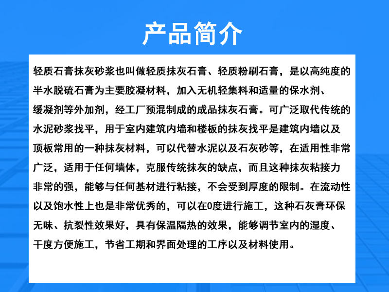 轻质石膏砂浆是一种室内墙体和顶棚专用的绿色抹灰材料,是一款高性能内墙基底找平的材料。 采用优质的石膏、轻集料、环保添加剂等材料,经科学配方配制、全自动混合后精致而成,是一种节能墙体材料。 而传统水泥砂浆其自身的缺点,难以克服。 水泥行业是高能耗,高污染,高排放的行业,是国家淘汰落后产能的重要目标,相关产品取而代之势在必行。