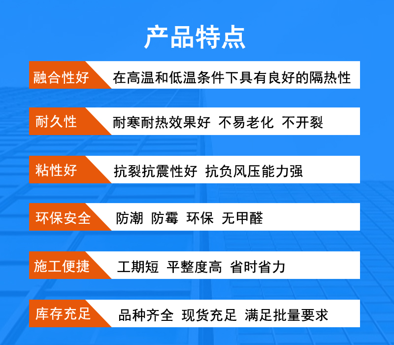 绿色环保。 生产和使用无任何污染、无辐射,具有良好的呼吸和透气性能,能调节室内空气湿度; 属A级防火材料,具有良好的保温隔热、隔音、耐火性能。 粘结力强,不易脱落,收缩性小,克服了传统水泥砂浆经常出现的空鼓、开裂现象,基本避免了抹灰质量通病。