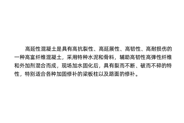 高延性混凝土是具有高抗裂性、高延展性、高韧性、高耐损伤的一种高富纤维混凝土,采用特种水泥和骨料,辅助高韧性高弹性纤维和外加剂混合而成,现场加水固化后,具有裂而不断、破而不碎的特性,特别适合各种加固修补的梁板柱以及路面的修补。